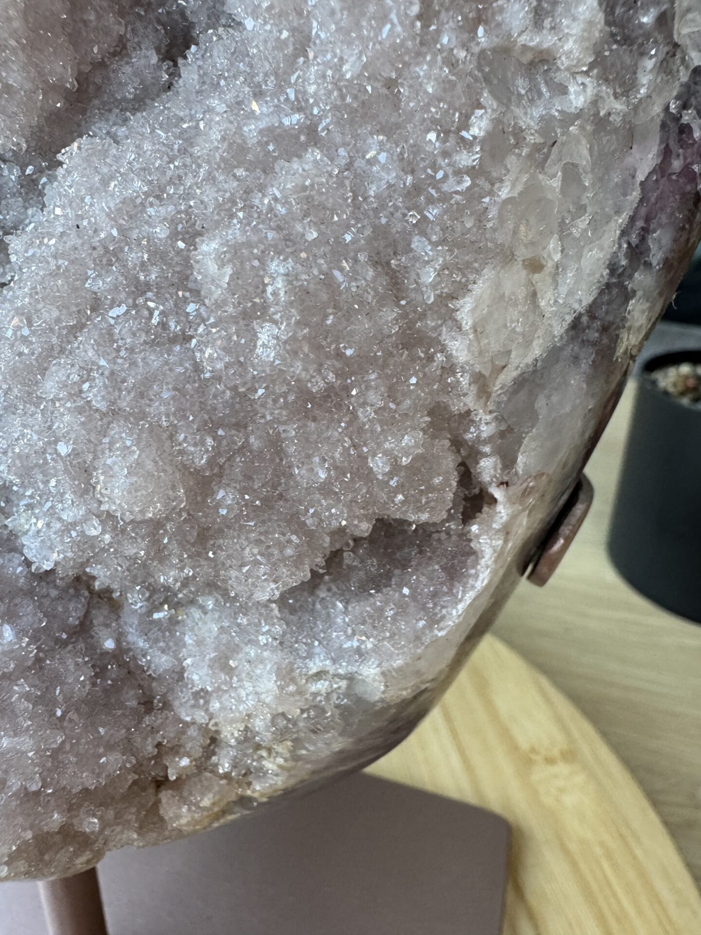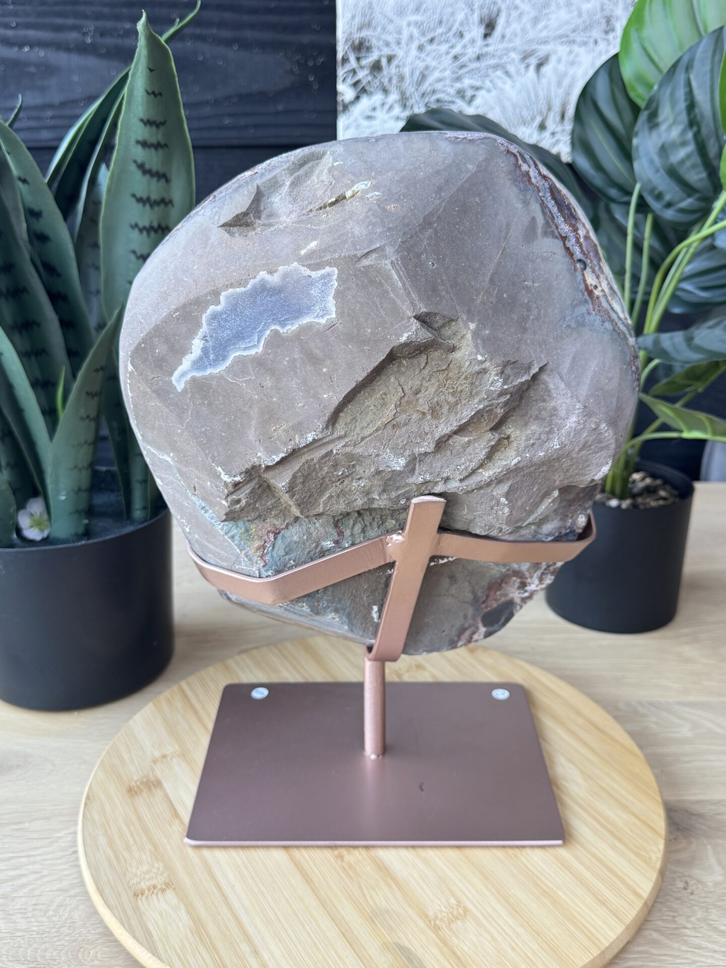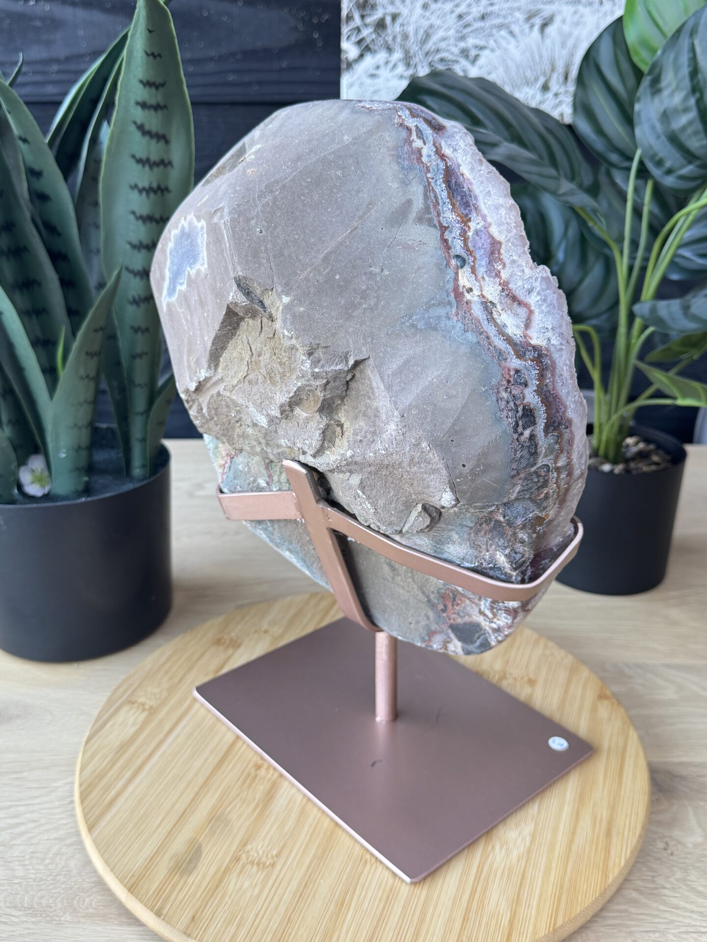 Mooie Roze Amethist statement slab op standaard. Roze Amethist is sinds 2018 op de markt en komt in deze vorm voornamelijk uit Brazilië.
