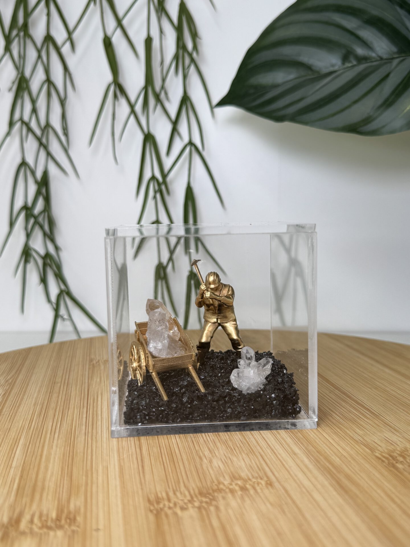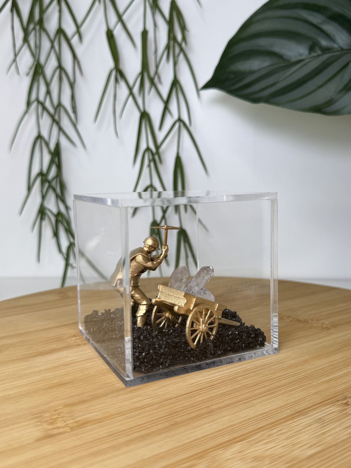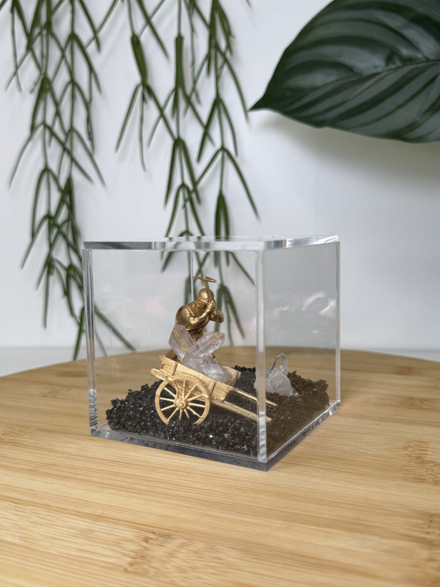 De boxen zijn van plexiglas gemaakt en daarin ligt een bodem van zwarte basalt. Basalt is een vulkanisch stollingsgesteente. Basalt ontstaat doordat lava stolt op het aardoppervlak en dan vrij snel afkoelt. Een andere benaming is ook wel uitvloeiingsgesteente. De box kan niet open en bevat een miner poppetje en een cluster van Bergkristal.