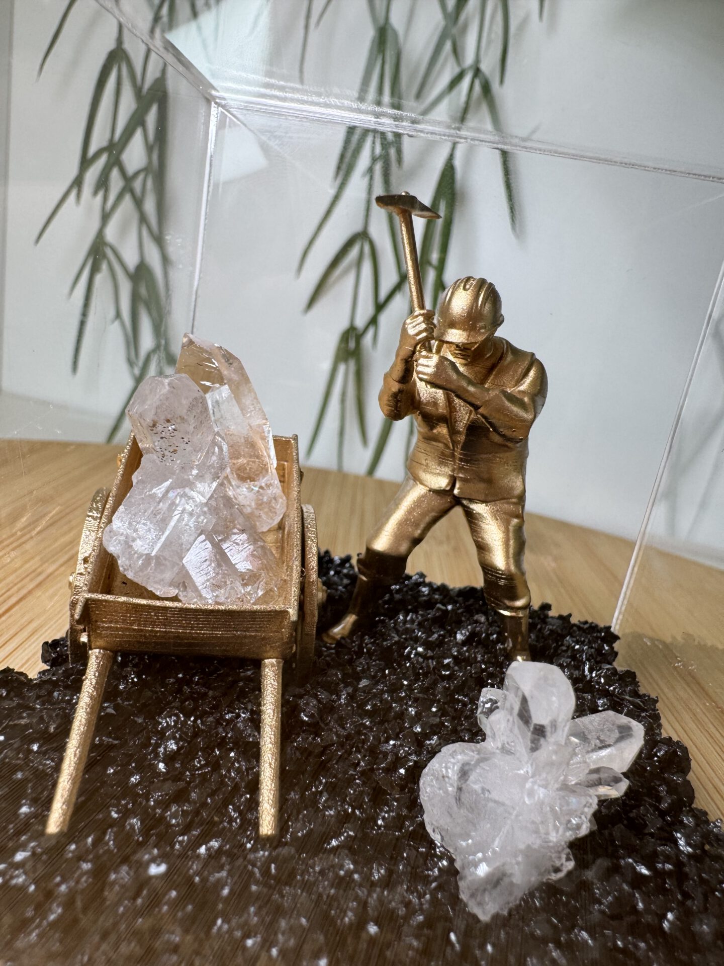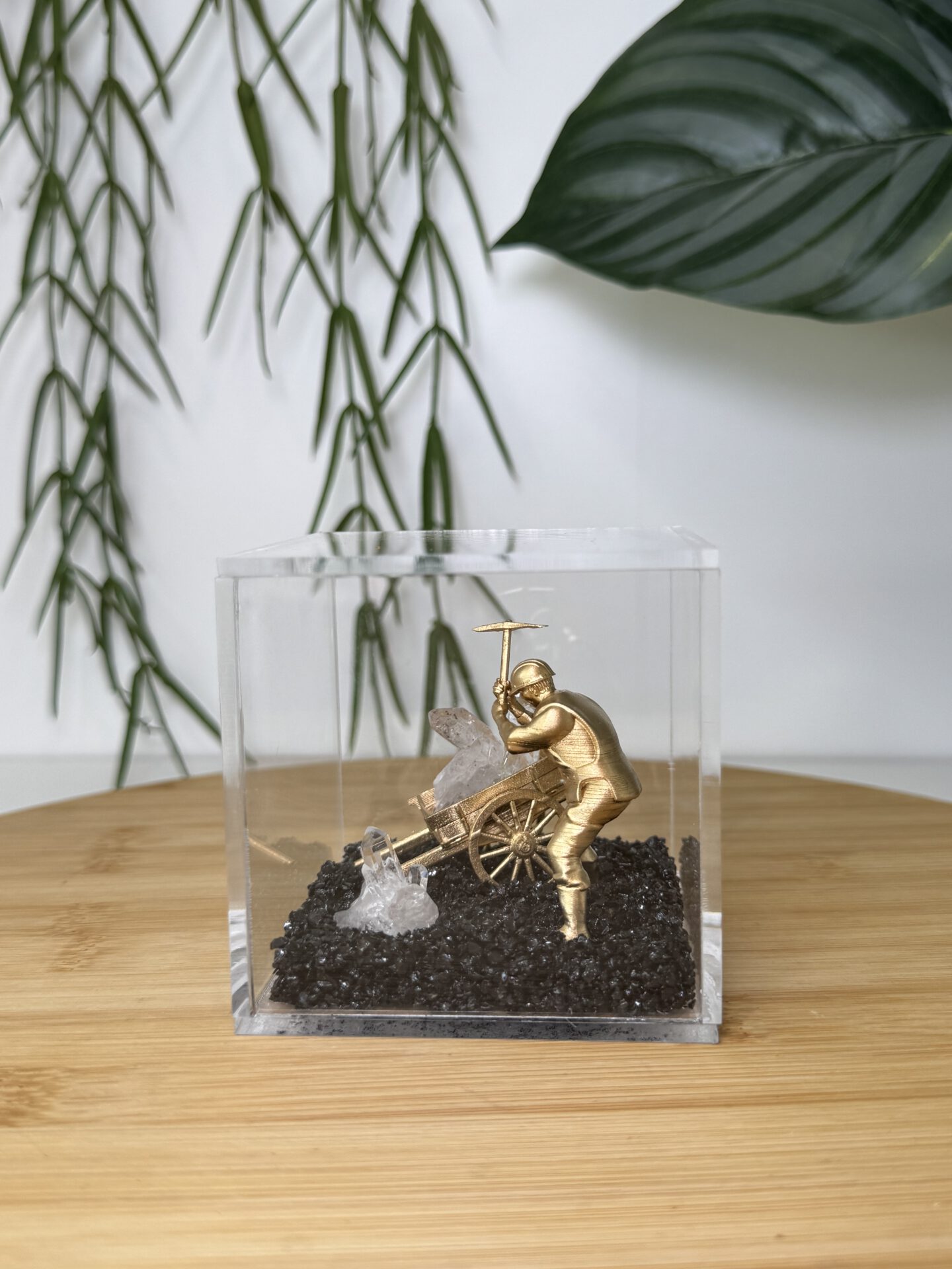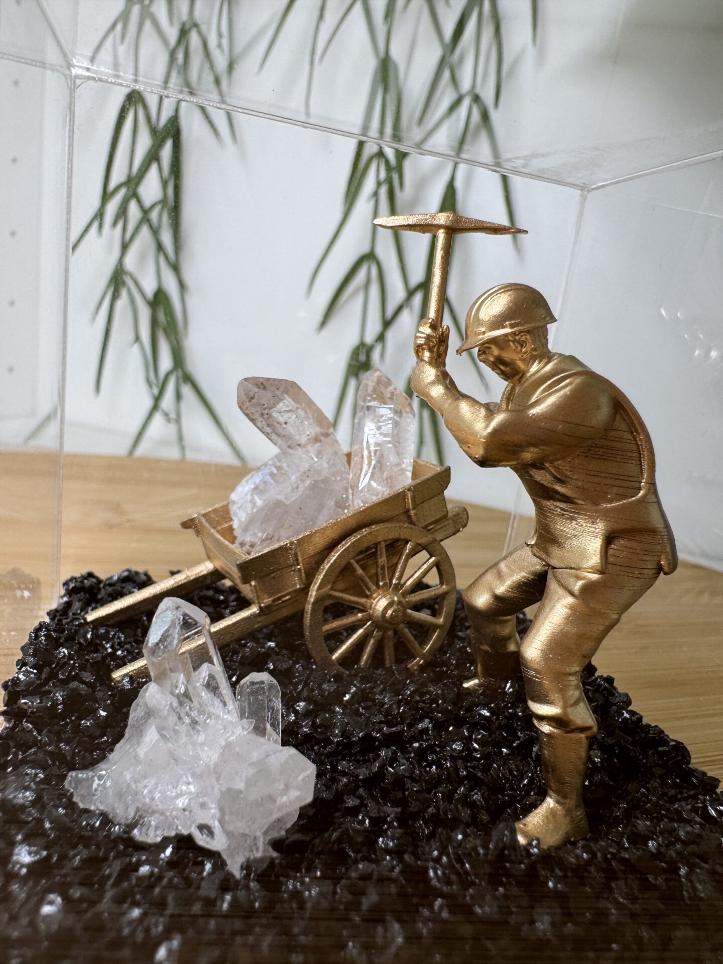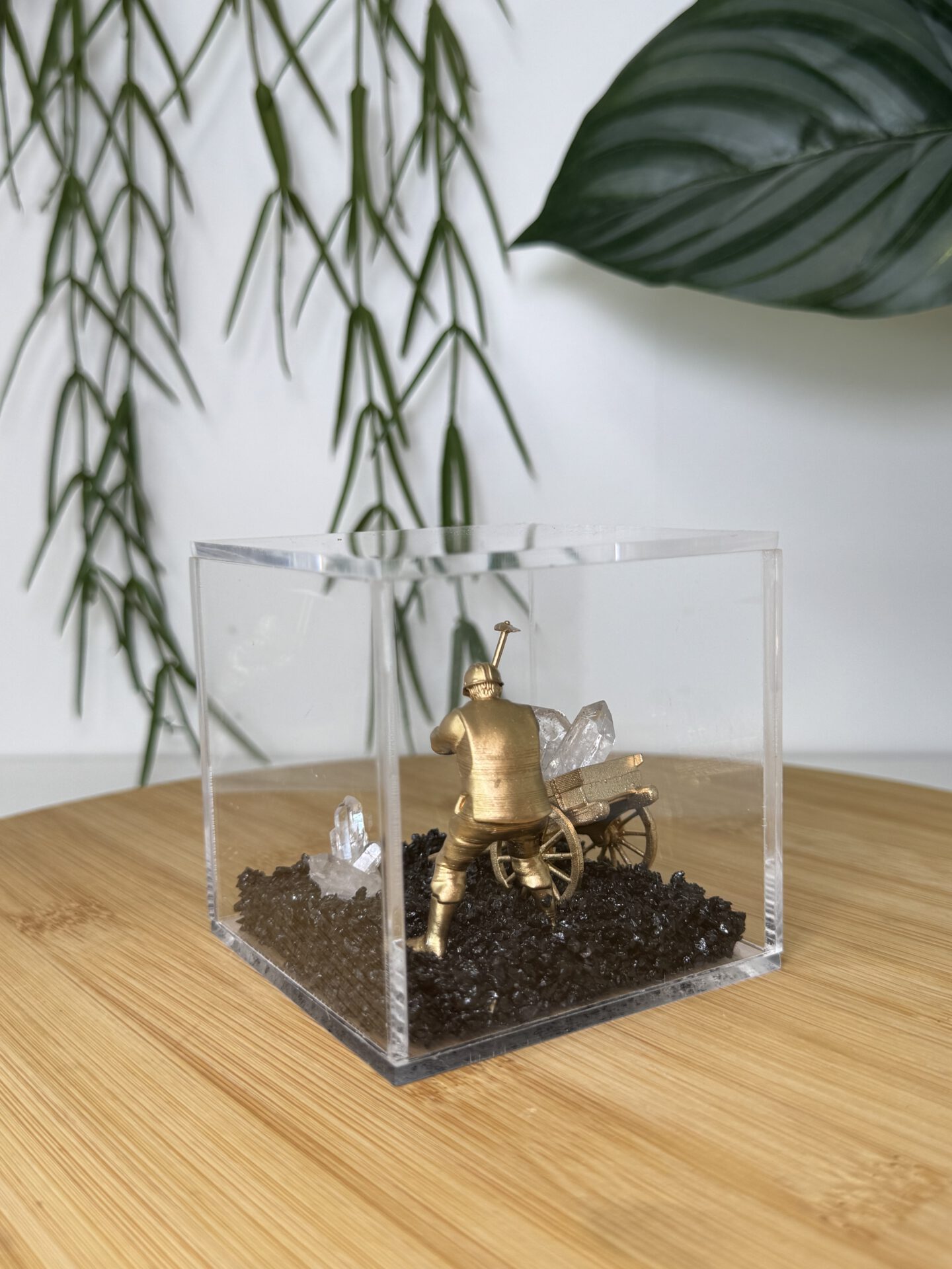 De boxen zijn van plexiglas gemaakt en daarin ligt een bodem van zwarte basalt. Basalt is een vulkanisch stollingsgesteente. Basalt ontstaat doordat lava stolt op het aardoppervlak en dan vrij snel afkoelt. Een andere benaming is ook wel uitvloeiingsgesteente. De box kan niet open en bevat een miner poppetje en een cluster van Bergkristal.