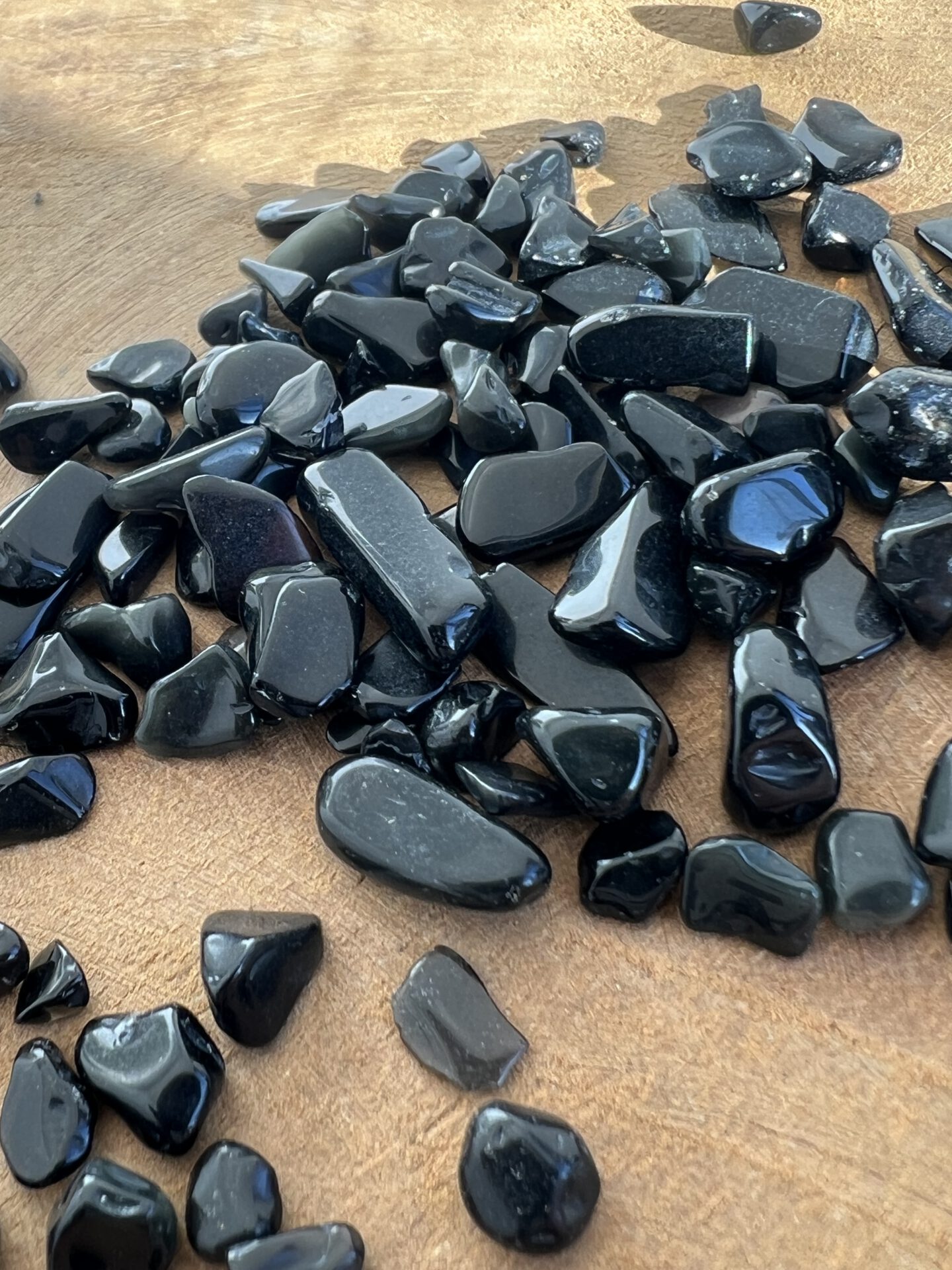 Mooie kwaliteit getrommelde zwarte obsidiaan chips.